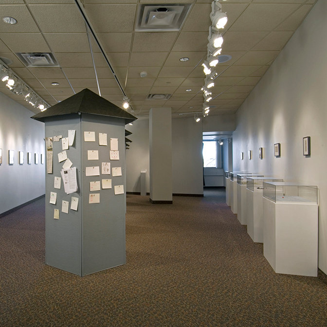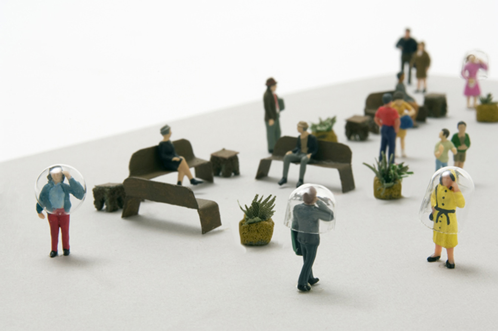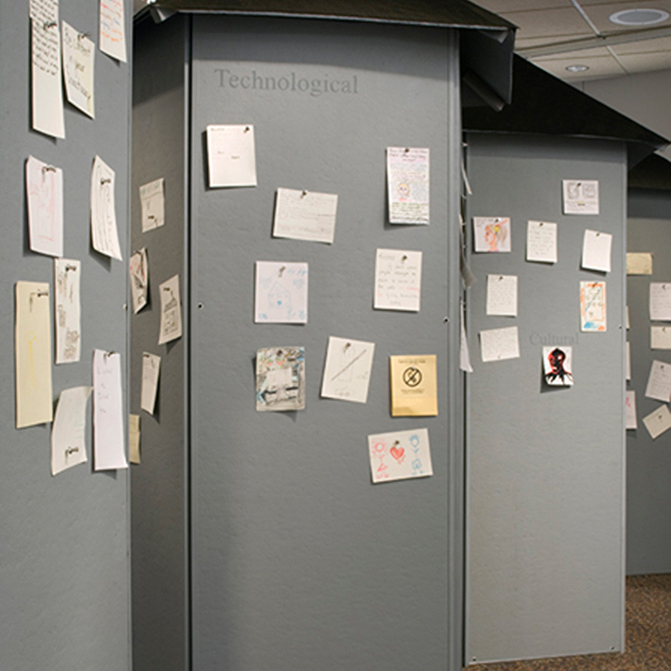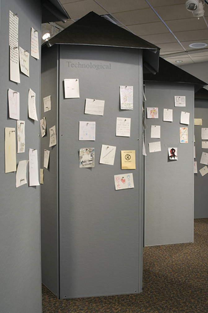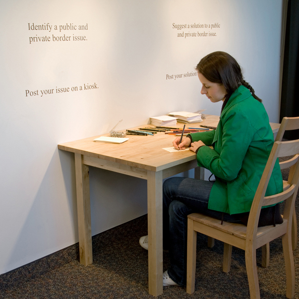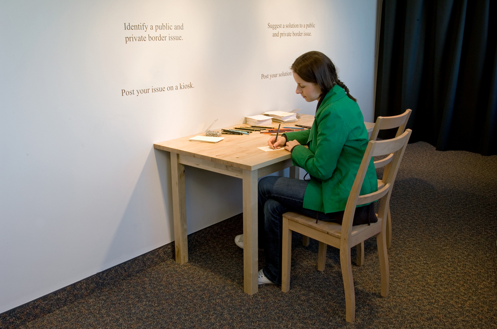 Presented at the Gage Gallery in the Lindell Library at Augsburg College, Borders invited visitors to post public/private challenges and their solutions on giant kiosks that bisected the gallery. I created a private space where they could think about issues and write them down. Framed text on the wall contained commentaries and research on the subject. Vitrines displayed models such as Cell Phone Shields, that proposed a solution to overhearing intimate conversations in public situations.