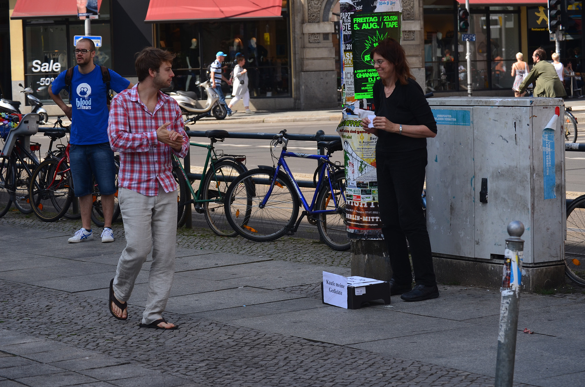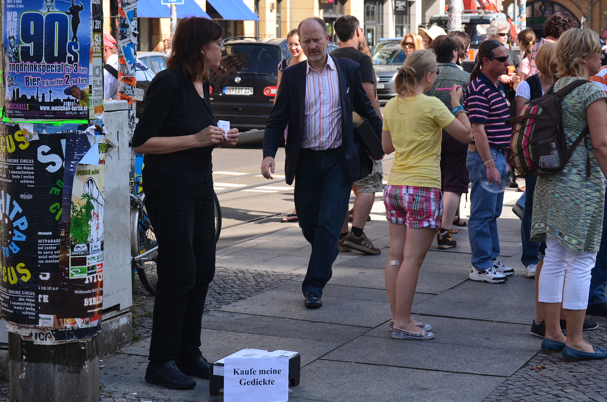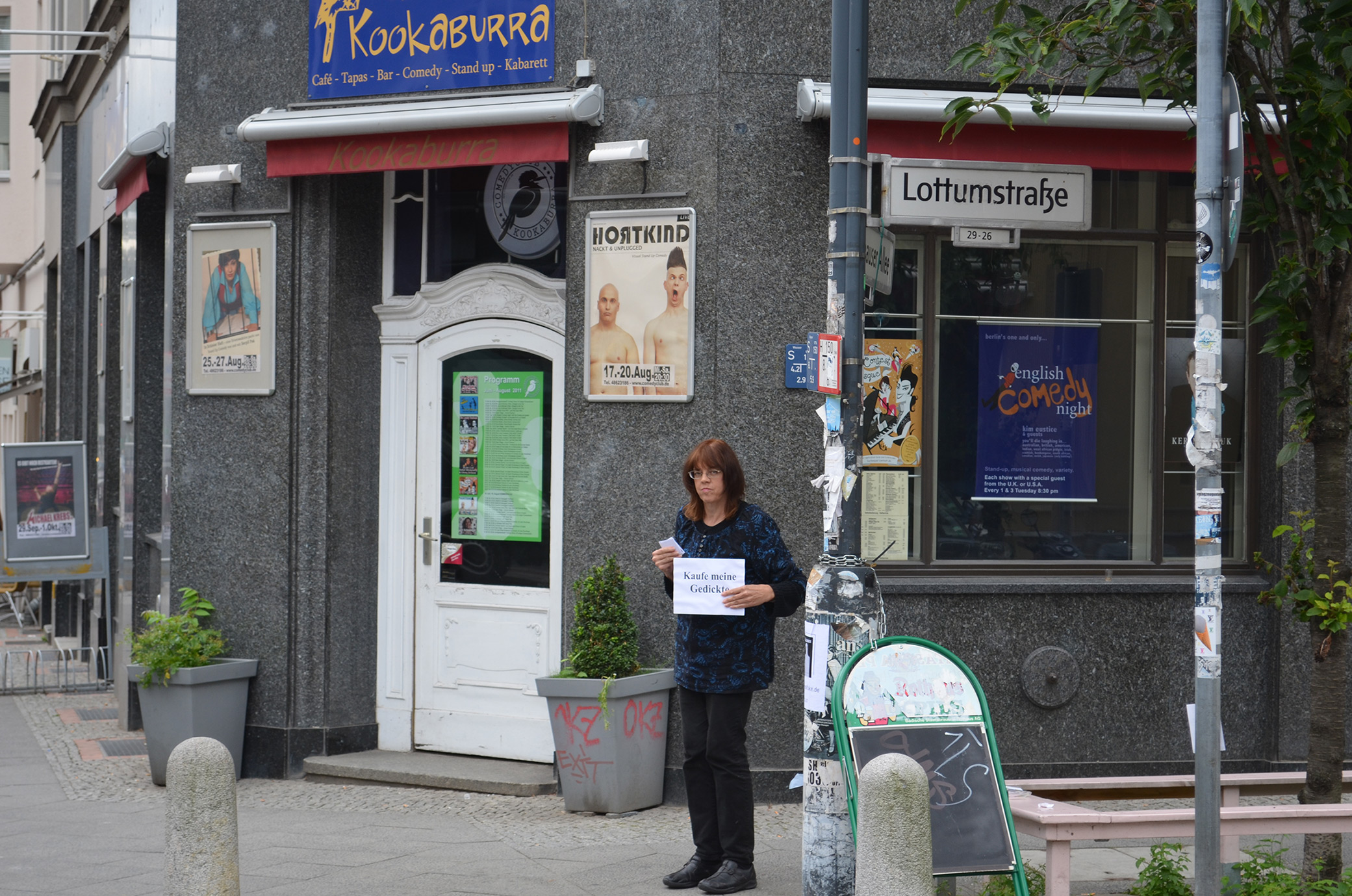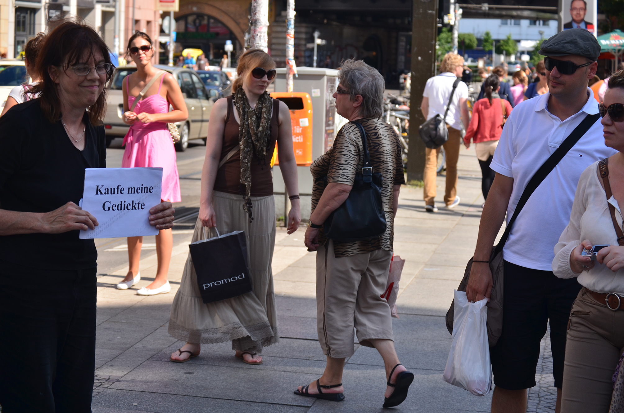 I sold my original poetry for the first time on the streets of Berlin in the summer of 2011. The three poems raised questions about the nature of art, the economics of making art, and the value assigned to artistic pursuits. I joined the panhandlers holding cardboard "Will Work for Food" signs on busy streetcorners. Survival and the sublime intermingled in this project designed during an uncertain economic climate.