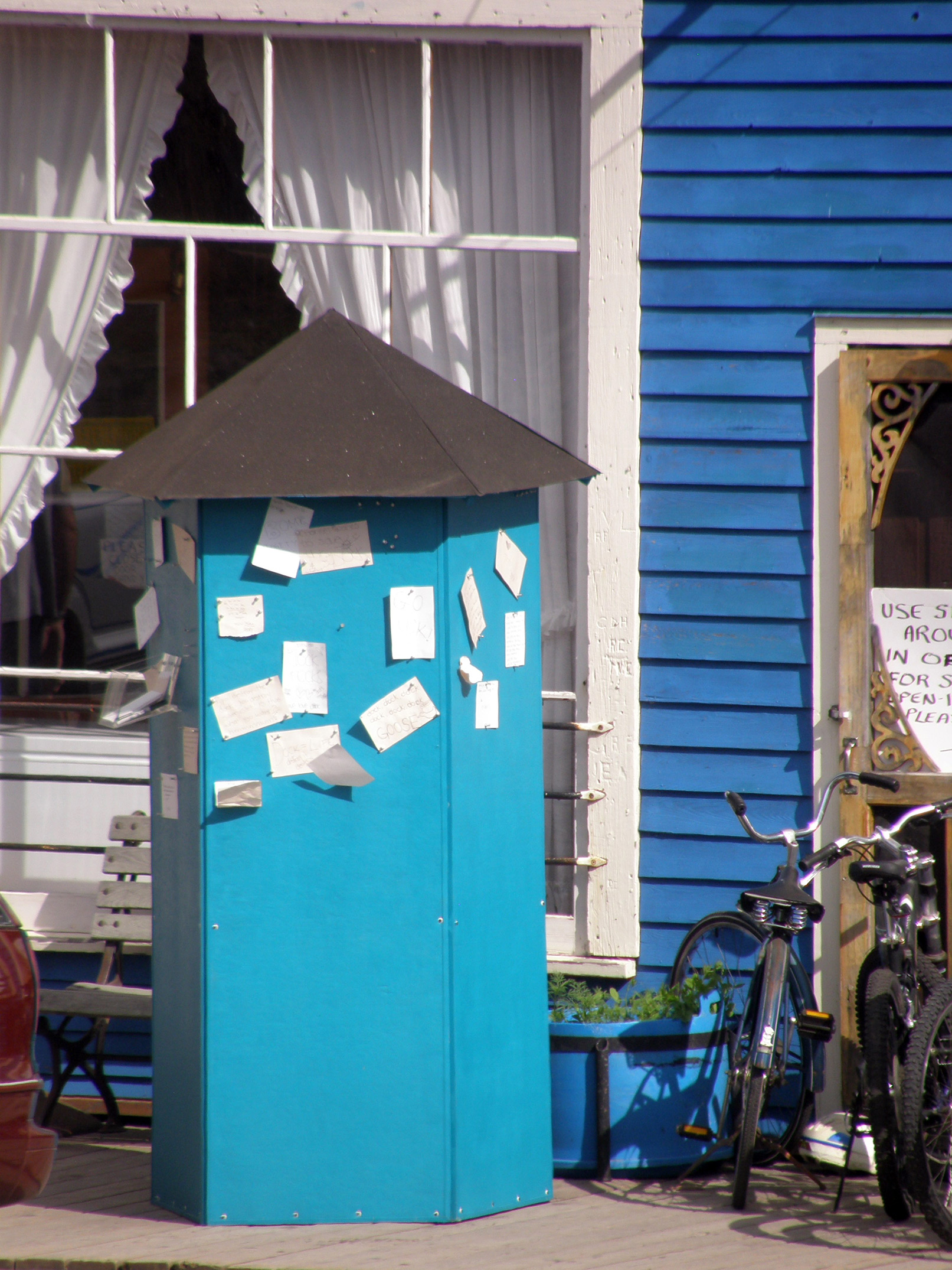 The Silver Islet project in Ontario, Canada, referenced how economics influences history. Now a picturesque summer vacation spot, Silver Islet was once the site of the richest offshore silver mine in the world. I erected a temporary kiosk in front of the old mining company store, currently a cafe and general store. I invited people to post comments about an issue that involved economics – the provincial government’s threat to remove the dock due to the high cost of renovation and maintenance.